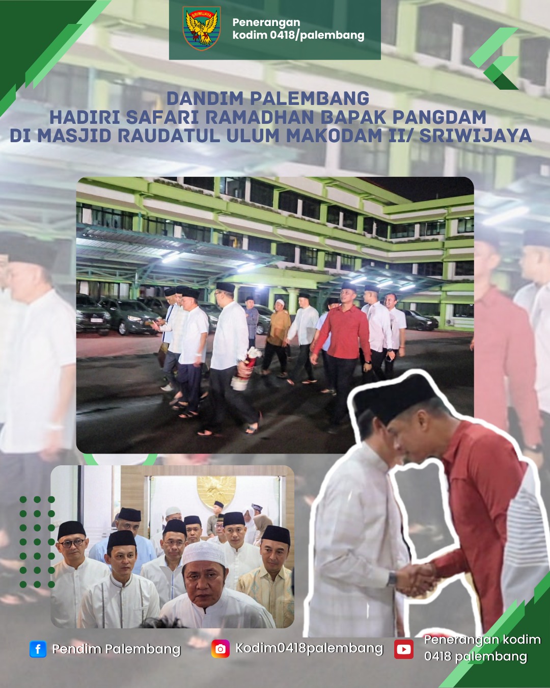 JURNAL10, PALEMBANG – Komandan Kodim (Dandim) 0418/Palembang, Erik Novianto,S.sos menghadiri kegiatan Safari Ramadhan 1447 H/2026 M yang digelar di Masjid Raudhatul Ulum Makodam II/Swj, Rabu (25/02/2026) malam.