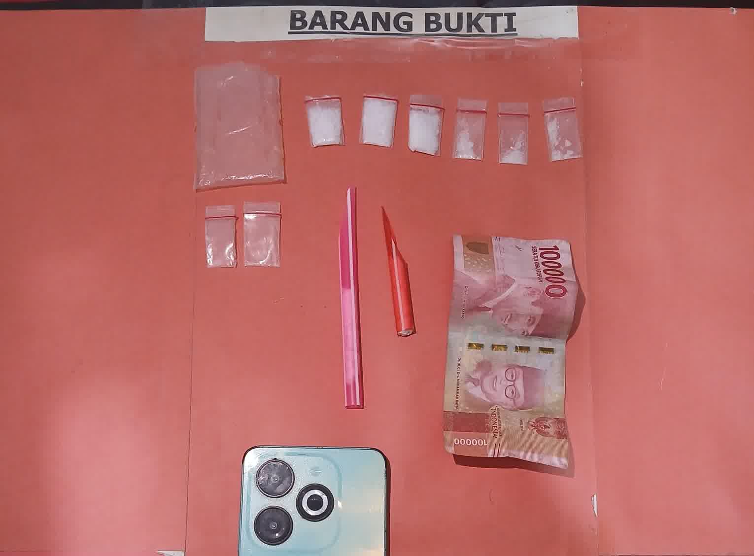Dalam penggeledahan di lokasi, petugas menemukan barang bukti berupa satu kantong plastik berisi enam paket sabu dengan berat bruto 3,08 gram. Selain itu, turut diamankan dua klip bening kosong, dua buah skop plastik, satu unit telepon genggam merek Infinix, serta uang tunai sebesar Rp100.000 yang diduga hasil transaksi.