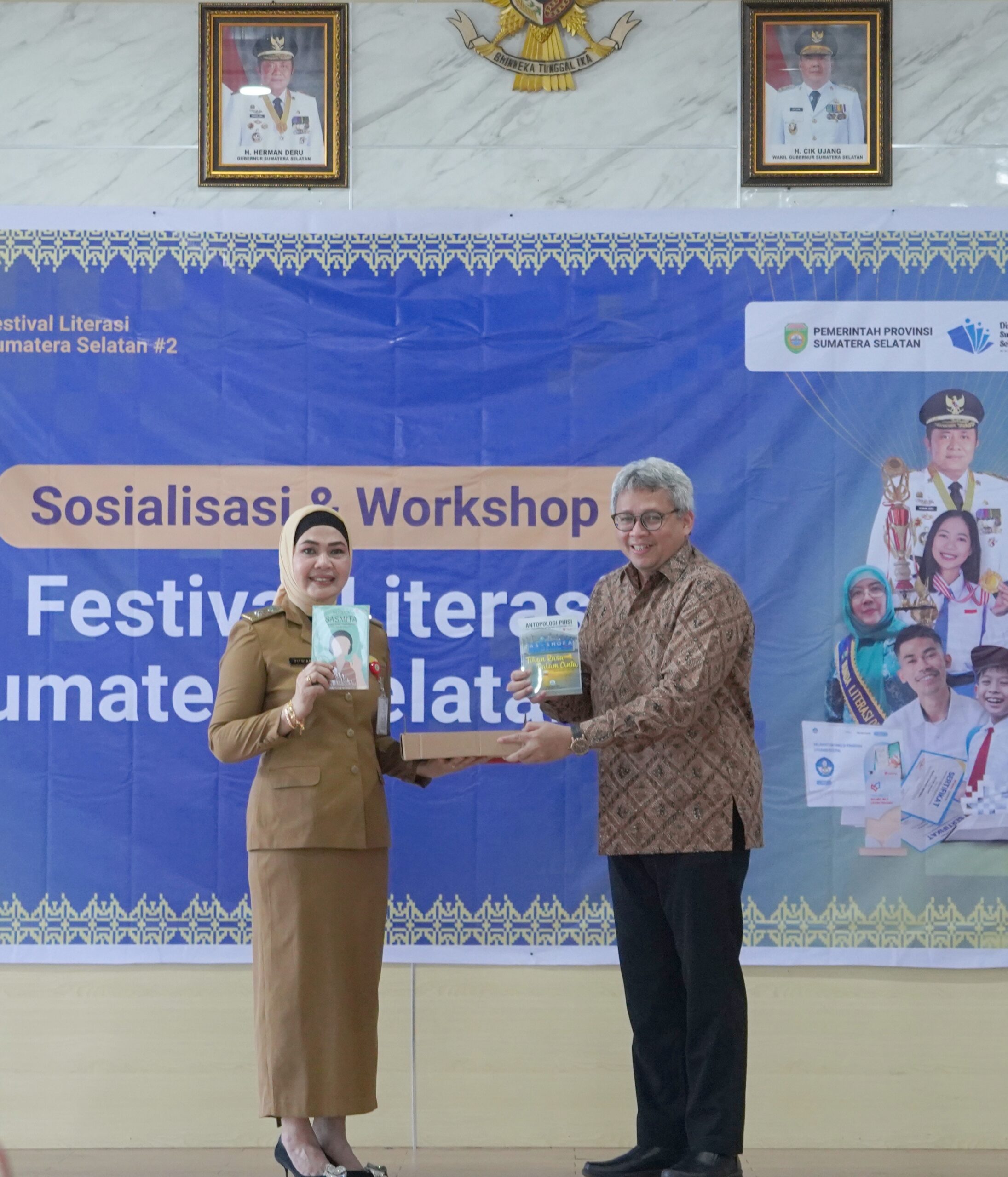 Simbolis Penyerahan Buku oleh Advisor Nyalanesia Imam Subhan kepada Kepala Dispustaka Sumsel Fitriana, S.Sos., M.Si