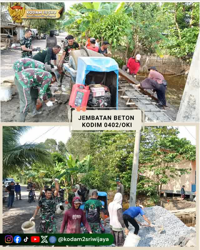 JURNAL10, SUMSEL – Komando Daerah Militer (Kodam) II/Sriwijaya beserta satuan jajarannya terus membuktikan komitmen dalam mendukung percepatan pembangunan infrastruktur di wilayah Sumatera Bagian Selatan dan Kepulauan Bangka Belitung. Melalui program kerja teritorial yang terintegrasi, pembangunan jembatan beton menjadi fokus utama guna meningkatkan konektivitas dan ekonomi warga masyarakat.