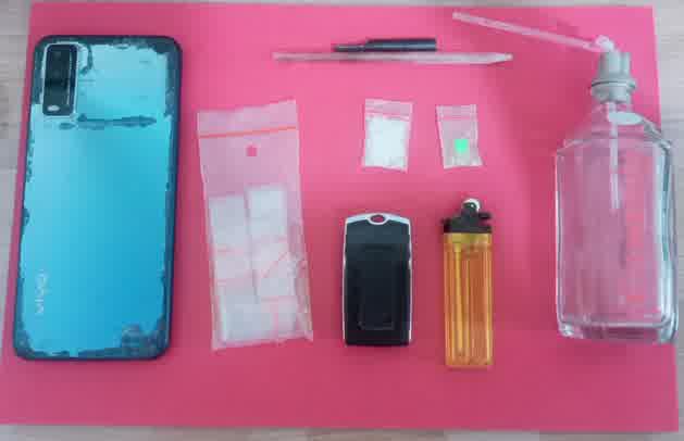 Petugas menemukan satu bungkus plastik bening berisi narkotika jenis sabu yang disembunyikan di atas bingkai foto yang tergantung di dinding ruang tengah. Selain itu, ditemukan pecahan tablet ekstasi warna hijau di atas kasur, serta alat hisap sabu dan timbangan digital di dalam rumah.