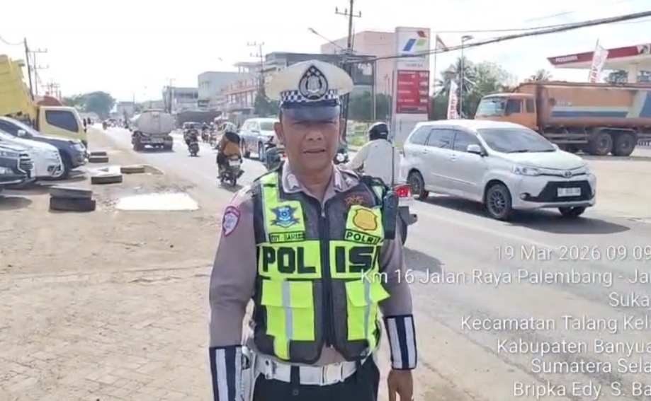 JURNAL10, BANYUASIN — Polres Banyuasin memastikan arus lalu lintas di Jalan Lintas Timur (Jalintim) Banyuasin tetap terkendali pada Kamis pagi (19/3/2026). Pemantauan dilakukan di empat titik strategis, disertai langkah solutif berupa pengoperasian Tol Fungsional Musi Landas dan Pulau Rimau dua arah untuk mendukung kelancaran arus mudik.