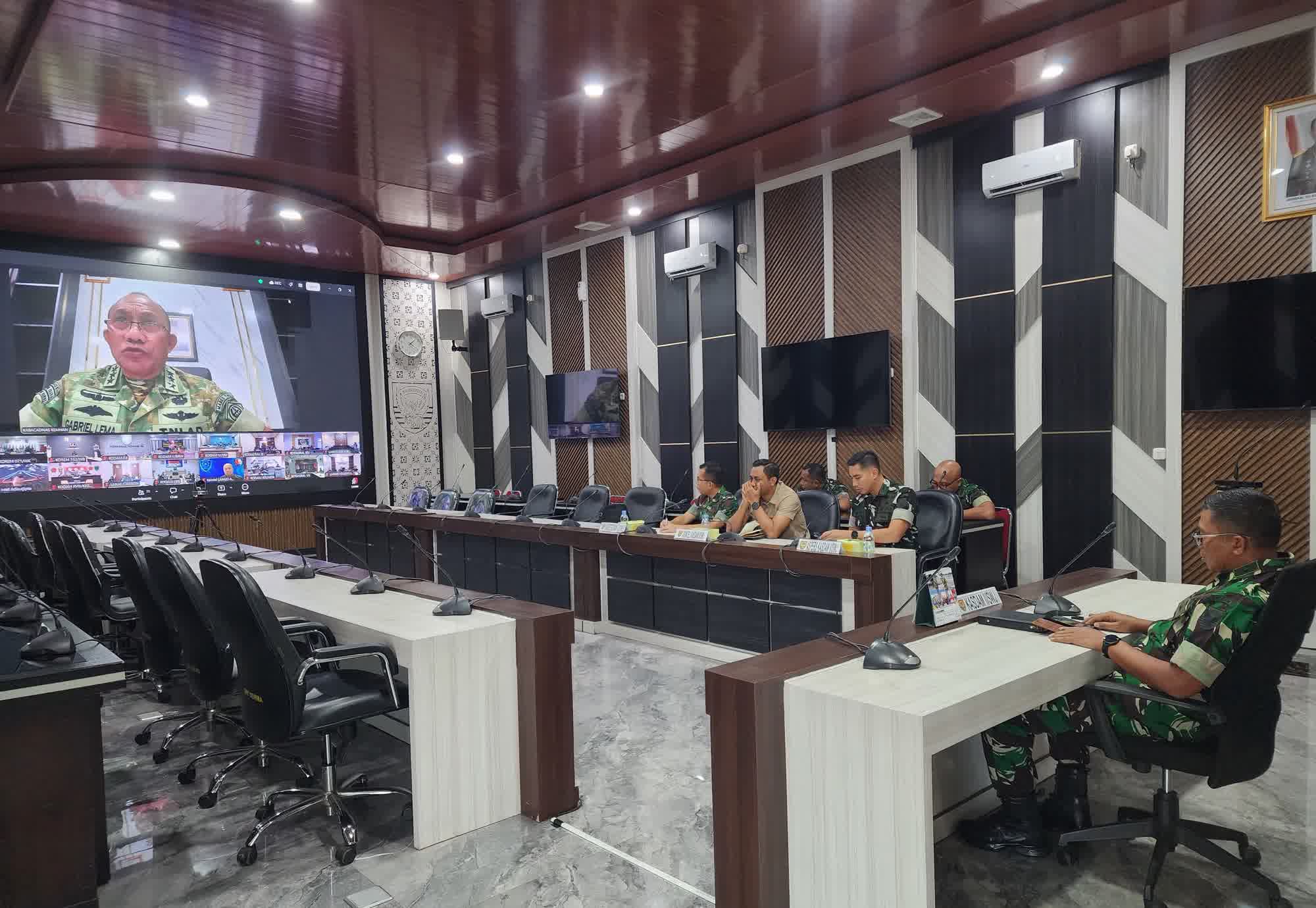 JURNAL10.COM, PALEMBANG – Kasdam II/Sriwijaya, Brigjen TNI Iwan Ma’ruf Zainudin, S.E., M.M., memimpin jajaran Pabandya Kodam II/Swj dalam mengikuti Rapat Koordinasi Teknis (Rakornis) Lanjutan Penyiapan Seleksi Rekrutmen Sarjana Penggerak Pembangunan Indonesia (SPPI), Koperasi Desa Kelurahan Merah Putih (KDKMP) dan Kampung Nelayan Merah Putih Tahun 2026, Palembang, Senin (27/04/2026) dan kegiatan ini dilaksanakan terpusat dari Ruang Rapat Puskodalopsdam II/Swj, Palembang, melalui sarana Video Conference (Vicon) guna menyelaraskan langkah strategis bersama jajaran pusat.