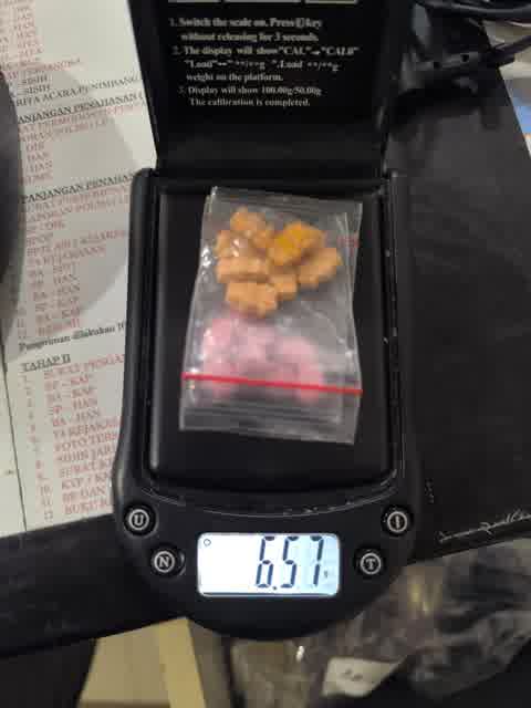 Dari tangan tersangka, petugas menyita barang bukti berupa 16 butir pil ekstasi dengan bentuk yang tidak lazim, yakni delapan butir berwarna merah muda berbentuk granat dan delapan butir berwarna oranye berbentuk karakter “Labubu”. Seluruh barang bukti memiliki berat bruto 6,57 gram, terdiri dari 3,20 gram pil bentuk granat dan 3,37 gram pil bentuk karakter.
