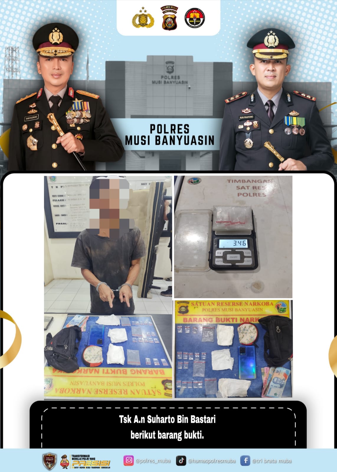 Sementara itu, Kabid Humas Polda Sumatera Selatan Nandang Mu’min Wijaya mengapresiasi kinerja Polres MUBA yang terus konsisten dalam pengungkapan kasus narkotika.