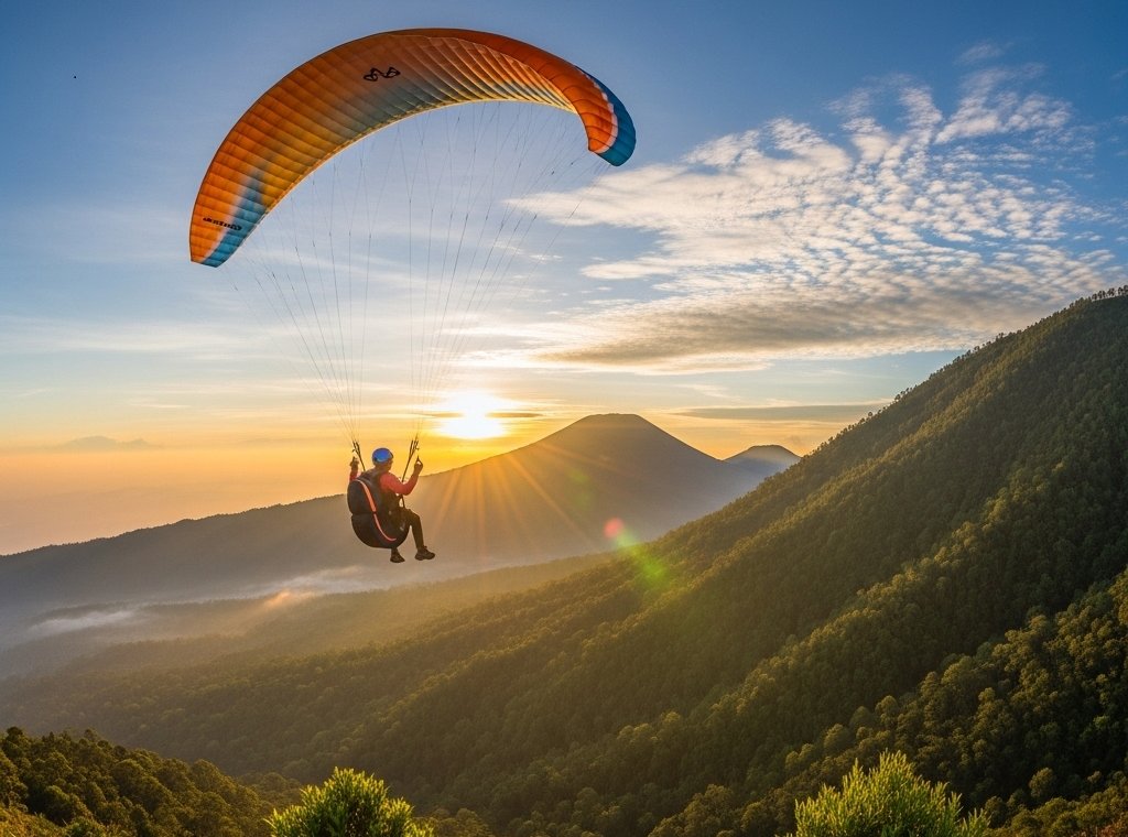 Lokasi paralayang di Pagar Alam biasanya berada di Bukit Tegur Wangi dan kawasan di sekitar Gunung Dempo. Dari ketinggian ini, mata saya dimanjakan dengan panorama hijau yang tak putus: perkebunan kopi, hamparan sawah, hingga rumah-rumah kecil yang terlihat seperti miniatur. Di kejauhan, puncak Gunung Dempo berdiri gagah, kadang diselimuti kabut tipis yang membuat suasana kian magis.
