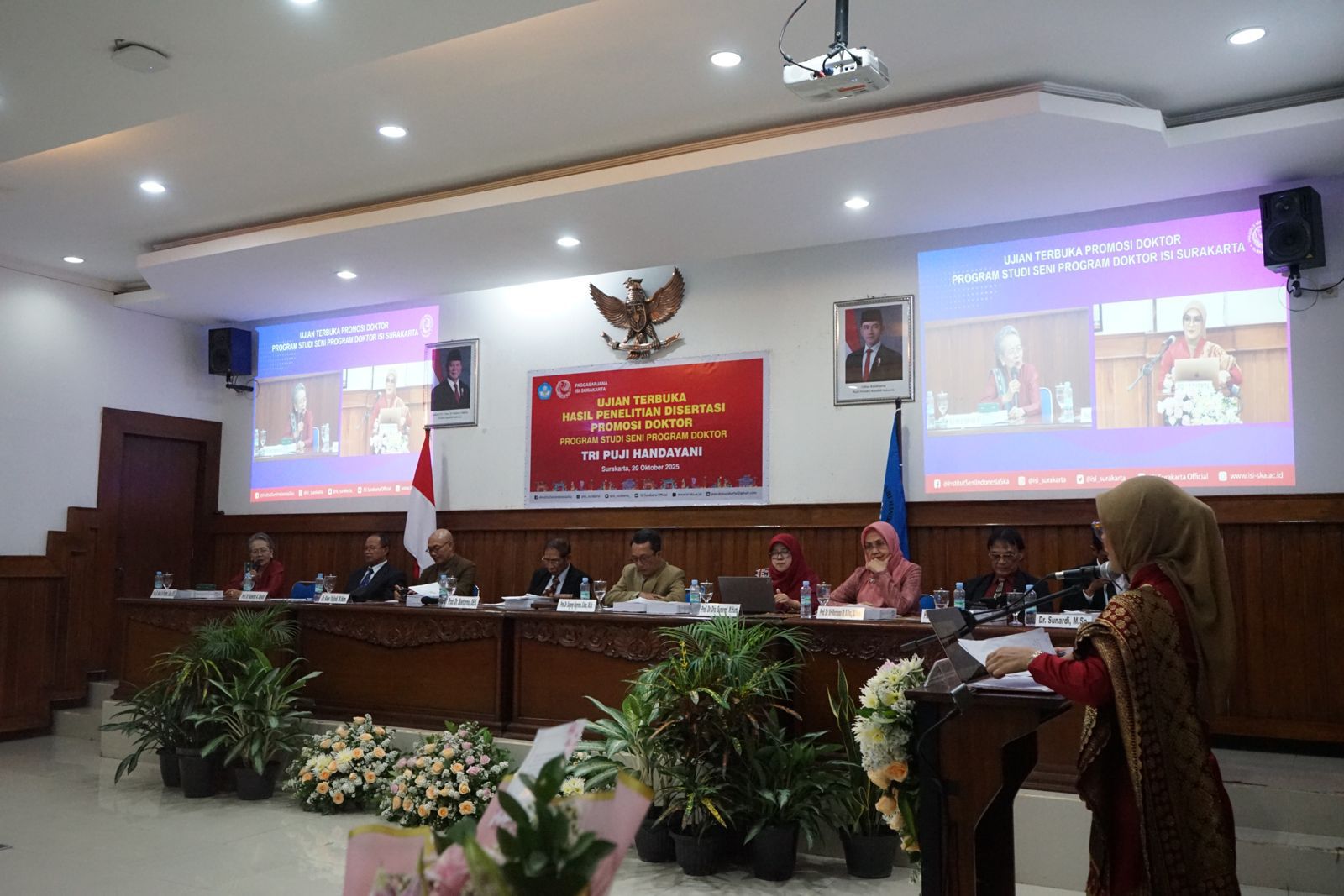 SURAKARTA, JURNAL10.COM | Sidang terbuka promosi doktor di Program Studi Seni, Program Doktor Pascasarjana Institut Seni Indonesia (ISI) Surakarta telah berlangsung dengan lancar pada Senin, 20 Oktober 2025, pukul 13.00 hingga 16.00 WIB. Sidang ini menjadi momen bersejarah bagi Tri Puji Handayani (NIM 213121003) yang berhasil mempertahankan disertasi berjudul “Dinamika Estetika Teater Dulmuluk di Palembang Sumatera Selatan (1974–2024)” dan resmi dikukuhkan sebagai Doktor Pengkajian Seni.